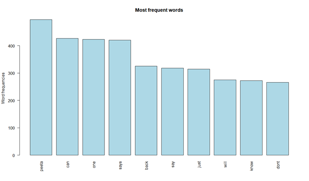 barplot(d[1:10,]$freq, las = 2, names.arg = d[1:10,]$word,